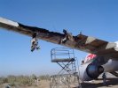 I flew in with a team on Tuesday in one of our Metros and some special equipment we'd had made locally in Bahrain and some provided by Airbus. Using a USAF D9 Caterpillar pulling a 100 metre cable fitted to the back end of each bogie and a nice new aircraft pushback tug with a towbar on the nose gear, we were able to remove the aircraft just on dusk on Tuesday night and towed it to an Iraqi Airways graveyard on one side of the terminal.